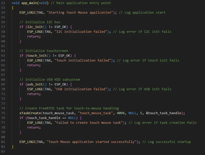 app_main is the main entry function of the program. Its function is to initialize the system peripherals and start the touch mouse task. It sequentially completes the initialization of the I2C bus, the initialization of the touch screen, and the initialization of the USB HID subsystem. If any initialization fails, it records the error and exits.