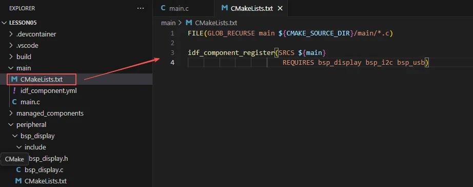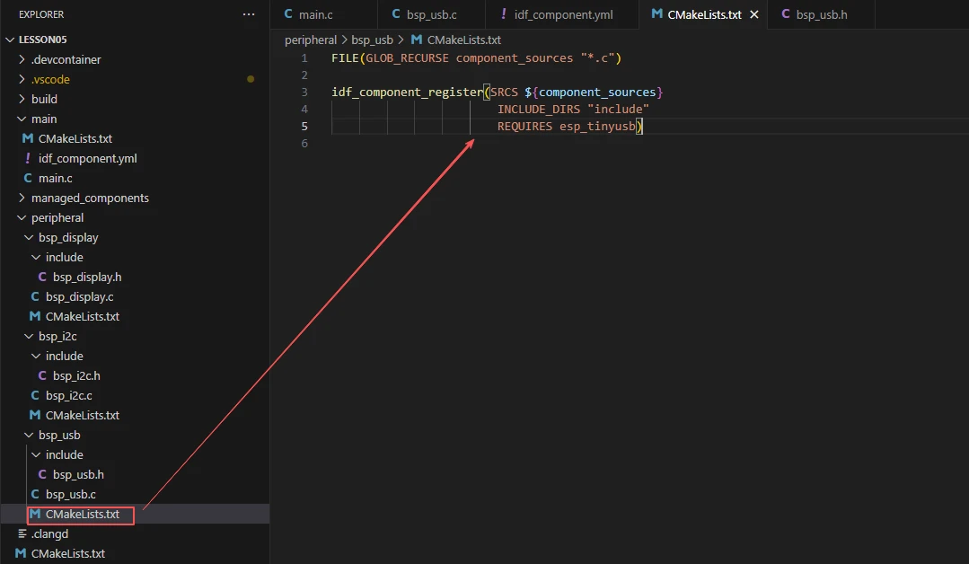 This file is placed in the "bsp_usb" folder and its main function is to inform the build system (CMake) of ESP-IDF: how to compile and register the "bsp_usb" component.