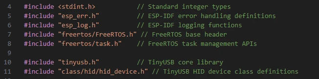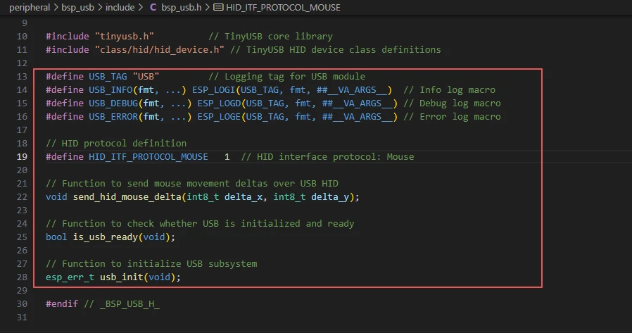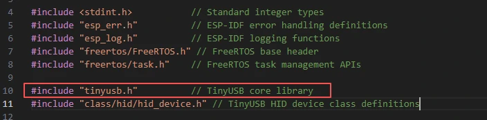 The reason why it is called esp_tinyusb here is that we called it in the "bsp_usb.h" file (for other libraries that are system libraries, there is no need to add anything).