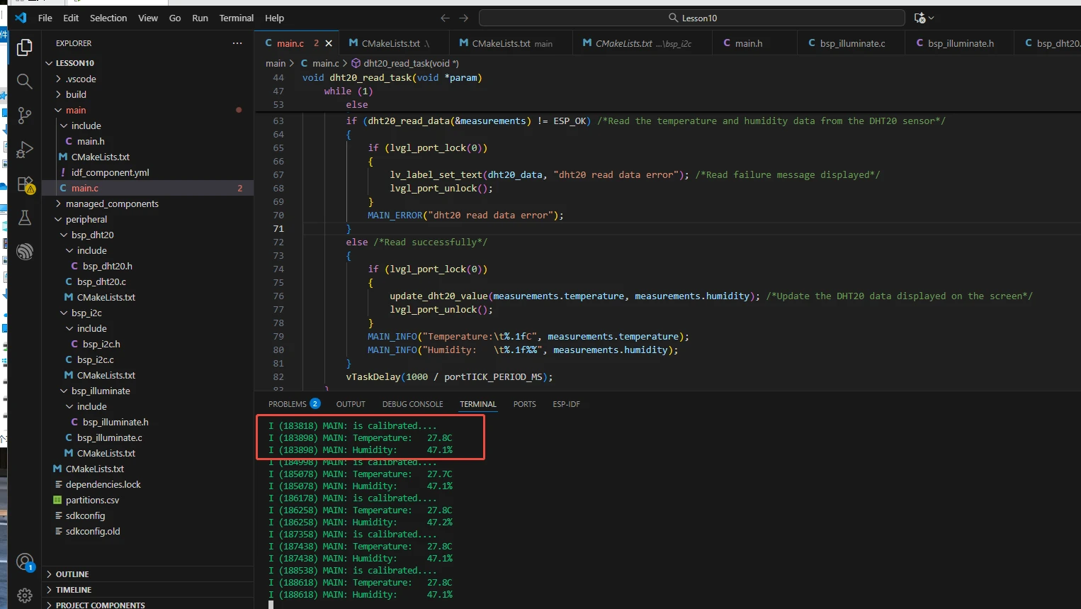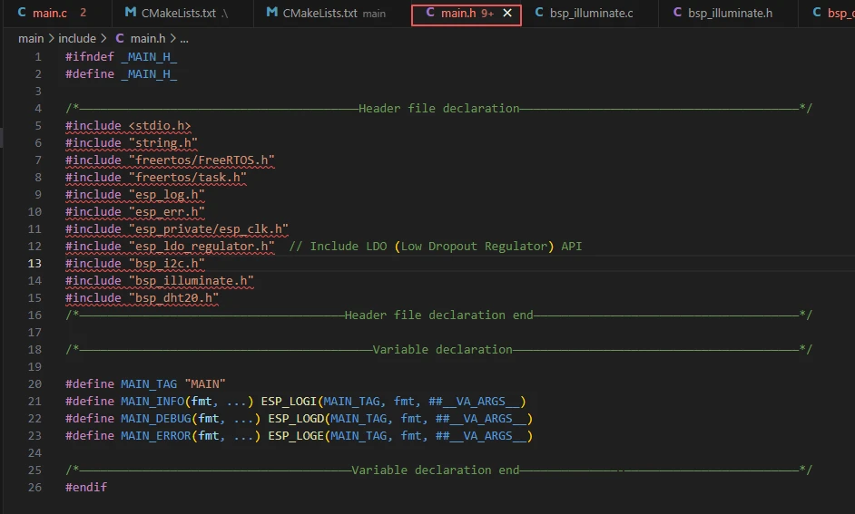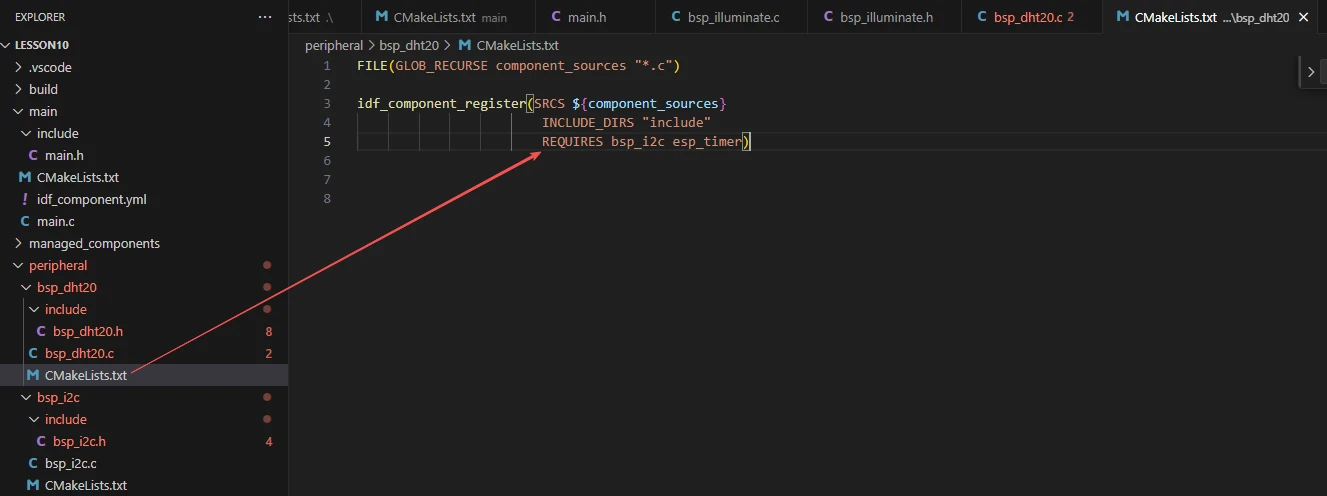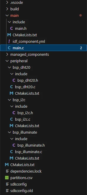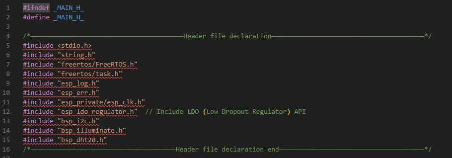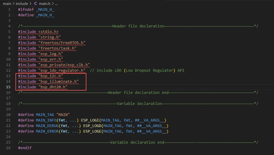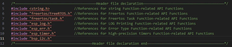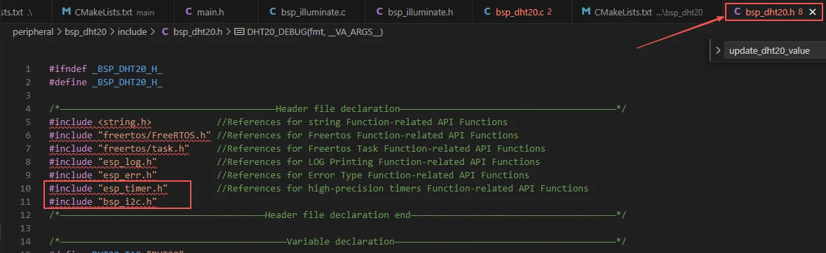 The reason we include bsp_i2c and esp_timer here is that they are explicitly used in "bsp_dht20.h". (Other system libraries do not need to be added because they are already integrated into the ESP-IDF framework by default.)