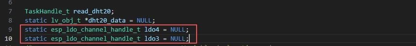 The following two lines of code define the control handles for LDO channels 3 and 4. They are used to bind to actual LDO power channels during subsequent initialization, enabling the program to control power output at different voltages.