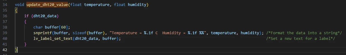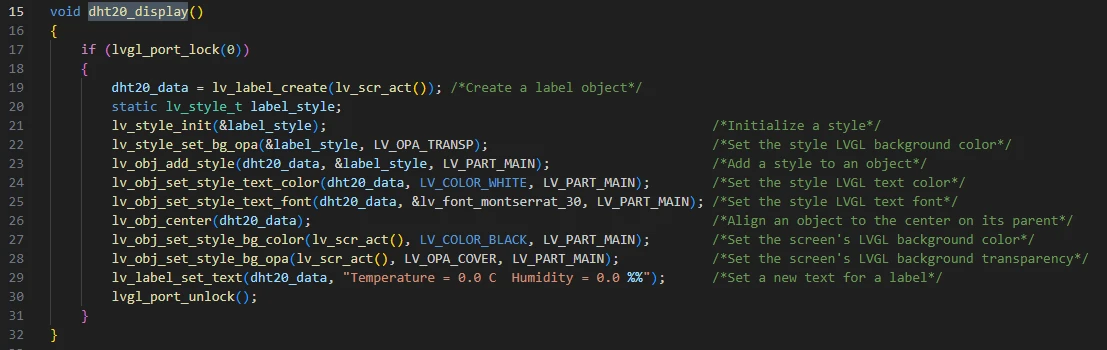 static lv_obj_t *dht20_data = NULL;: Declares a LVGL text label pointer (visible only within the current file), initially set to NULL. It is used to point to and manipulate the on-screen label that displays temperature and humidity data.
