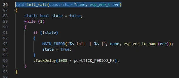Function: When initialization of a module fails, this function is entered to run in an infinite loop, printing an error message (including the module name and error code string) once per second.