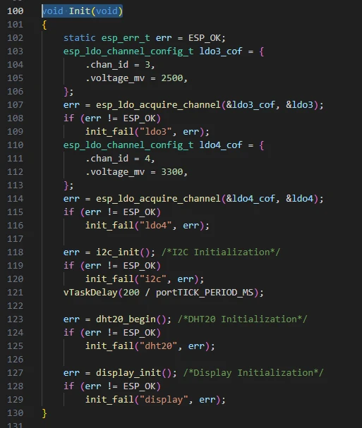 First, the Init function is called to initialize the following components in sequence: LDO power supply (to provide power for peripherals), I2C bus (the foundation for sensor communication), DHT20 sensor (to complete registration and status calibration), and display module. If initialization fails, an error is reported in a loop through init_fail.