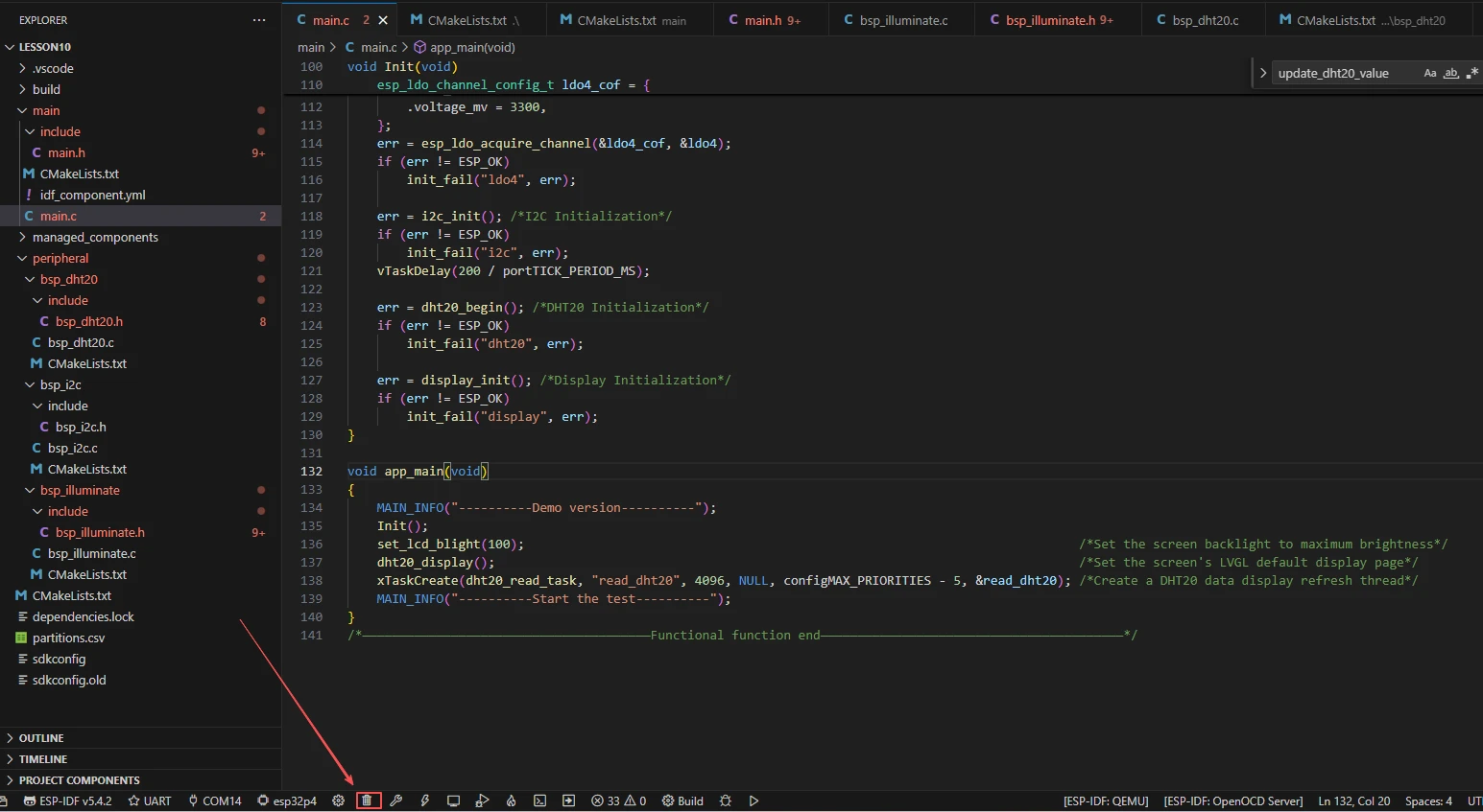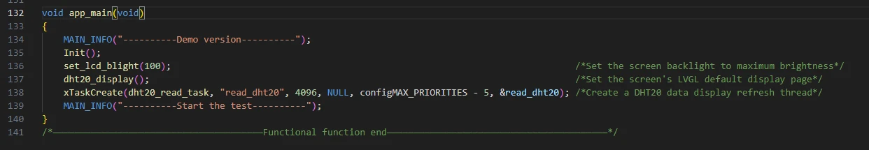 'app_main' is the program entry function. It first prints the demo version information, then calls 'Init' to complete hardware initialization. Next, it sets the screen backlight to maximum brightness, initializes the LVGL display interface via 'dht20_display', and creates a task named "read_dht20" to periodically read and refresh temperature and humidity data. Finally, it prints a test start message, initiating the operation of the entire DHT20 temperature and humidity acquisition and display system.
