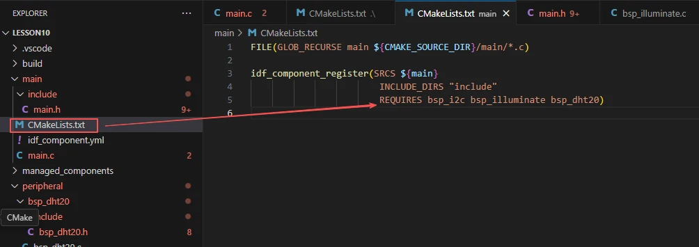 This file, placed under the bsp_dht20 folder, mainly functions to tell the ESP-IDF build system (CMake): how to compile and register the bsp_dht20 component.