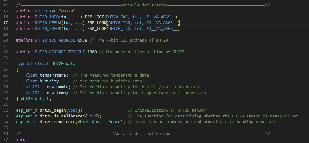 Centralizing these declarations in "bsp_dht20.h" is for the convenience of calling and management. (We will understand their roles when they are used in "bsp_dht20.c".)
