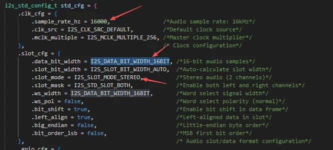 i2s_std_config_t std_cfg = {...}; ------ Configures standard I2S audio parameters: