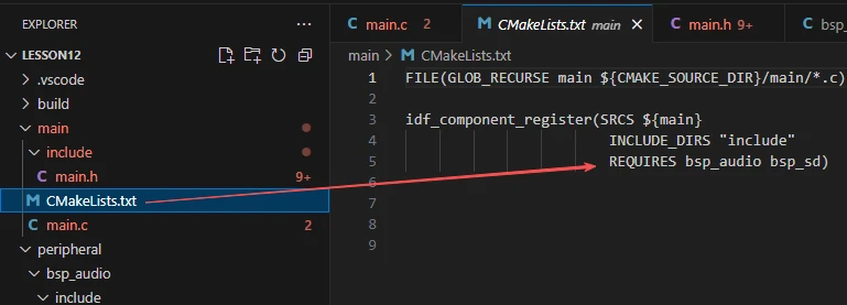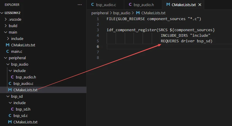 To call them, we must also configure the "CMakeLists.txt" under the bsp_audio folder. This file, placed in the bsp_audio folder, mainly functions to tell the ESP-IDF build system (CMake) how to compile and register the bsp_audio component.