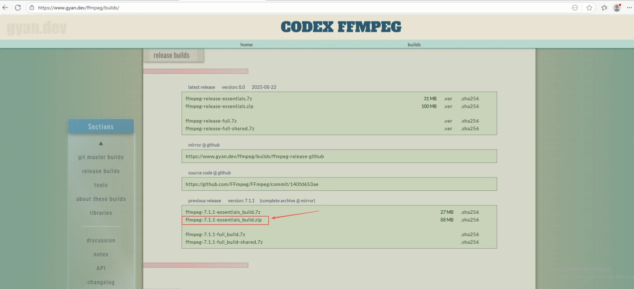 Scroll down to find the "release builds" section, then select "ffmpeg-7.1.1-essentials_build.zip".