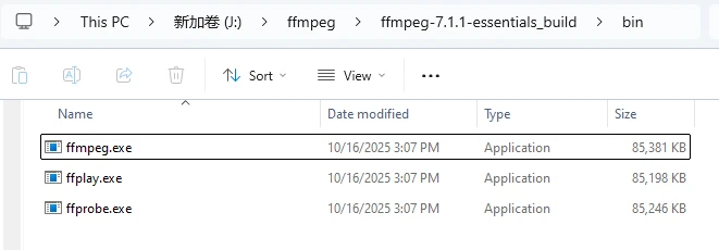 Navigate to the "bin" directory, and you will see three core executable files of FFmpeg: "ffmpeg.exe", "ffplay.exe", and "ffprobe.exe".