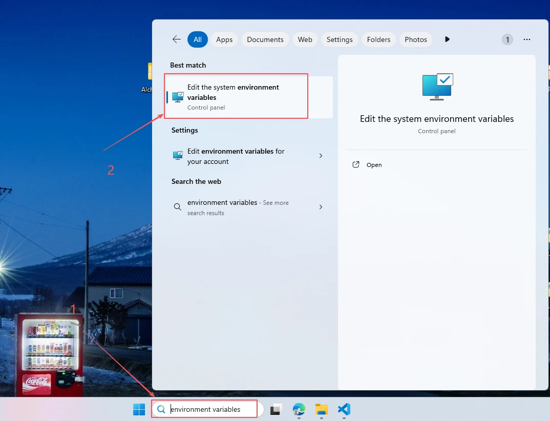 Search for "Environment Variables" in the Start Menu at the bottom left of the desktop, find "Edit the system environment variables", and click to open it.