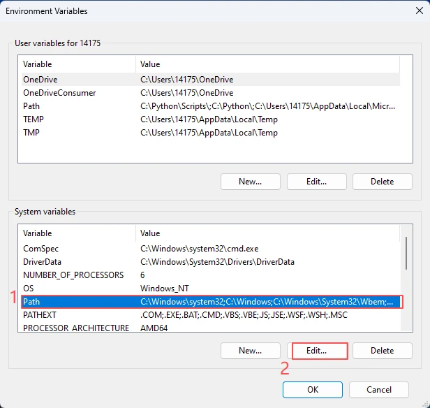 Locate the "Path" entry under "System Variables" and click "Edit".