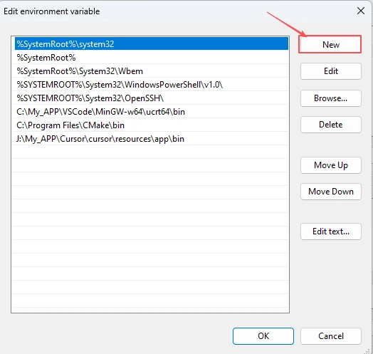 In the "Edit environment variable" window, click "New".