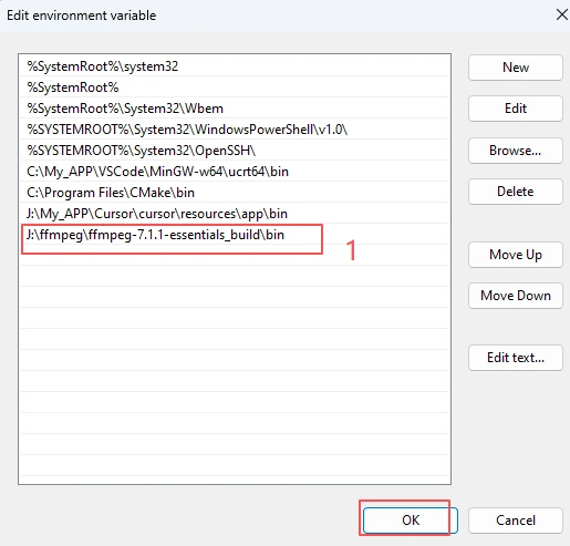 Note: Ensure the path is accurate so the system can correctly locate the FFmpeg files.