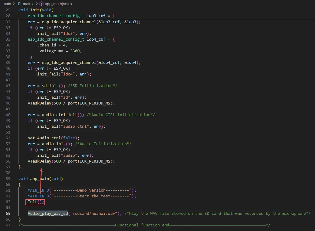 The Init() function is used to initialize the hardware required for the audio playback system, including configuring and obtaining LDO3 (2.5V) and LDO4 (3.3V) channels, initializing the SD card for reading WAV files, initializing the audio controller and turning off the audio hardware, as well as initializing the I2S audio channel to prepare for WAV playback. If any step fails, it will call init_fail() to print an error and stop program execution.