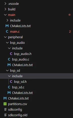 The "CMakeLists.txt" file integrates the drivers into the build system. This allows the project to utilize the functions defined in "bsp_audio.c" --- including parsing WAV audio and playing WAV audio from the SD card --- as well as the functions in "bsp_sd.c" --- such as initializing the SD card and retrieving SD card information.