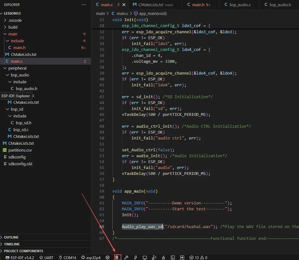 After waiting for the SD card and other components to complete initialization, the next step is to execute Audio_play_wav_sd from the bsp_audio component to play the converted WAV audio files stored in the SD card.