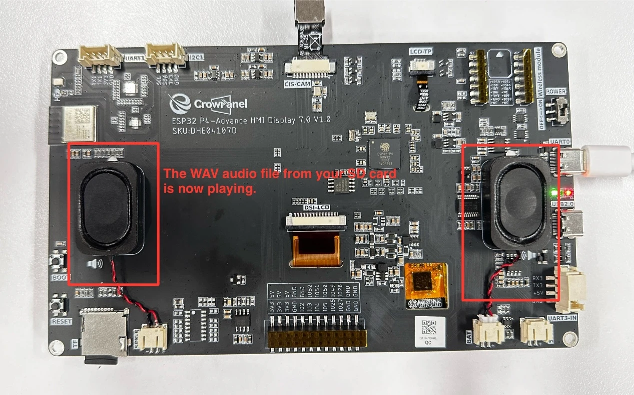 After running the code, you will be able to hear the WAV audio saved in your SD card playing through the speaker on the Advance-P4.