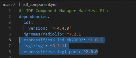 During the subsequent compilation process, the project will automatically download the following libraries: jgromes/radiolib version 7.2.1, espressif/esp_lcd_ek79007 version 1.0.2, lvgl version 8.3.11, and espressif/esp_lvgl_port version 2.6.0. Once downloaded, these networking components will be stored in the managed_components folder. (This is automatically generated after specifying the version numbers.)