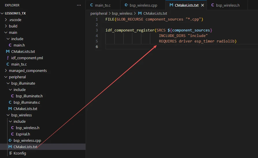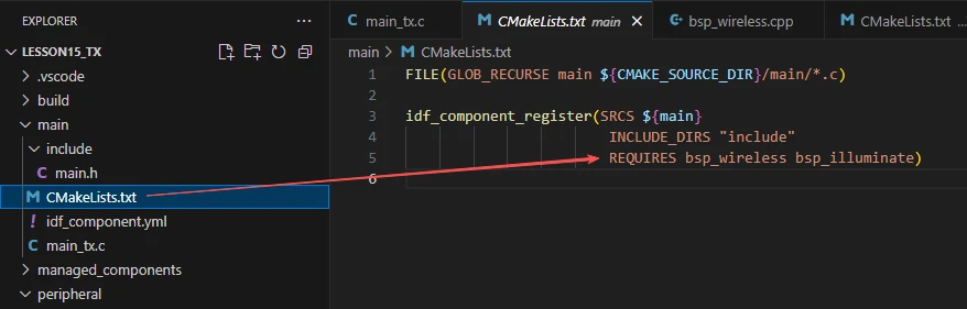 This ensures that during the build process, ESP-IDF knows to build bsp_wireless and bsp_illuminate first, and then build the main component.