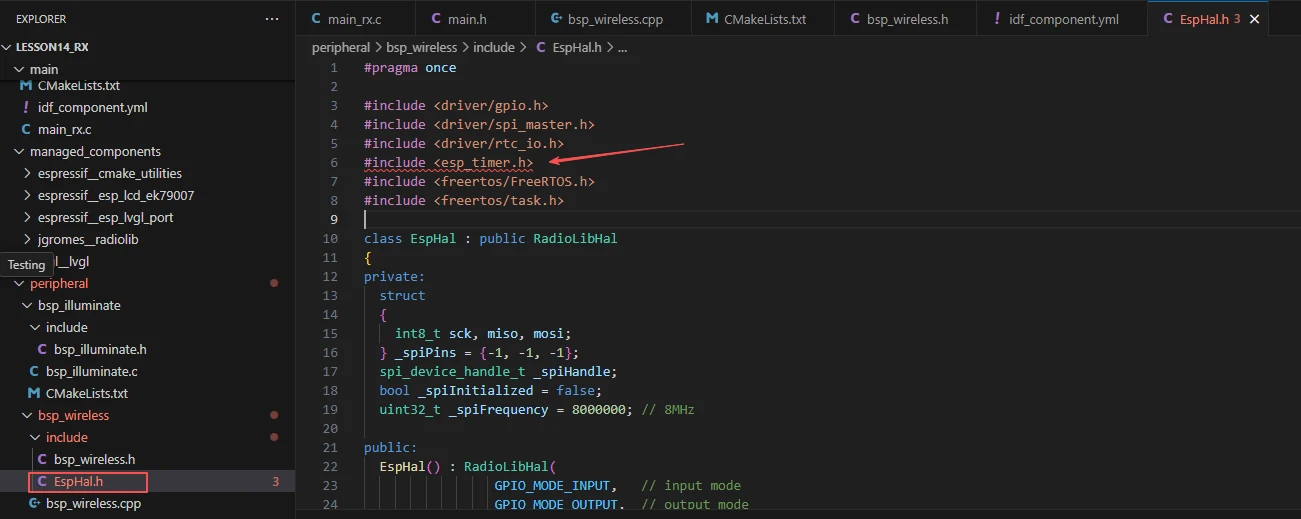 Since the function implementations in bsp_wireless.cpp use the function wrappers provided in EspHal.h, the header file needs to be included in the .cpp file.