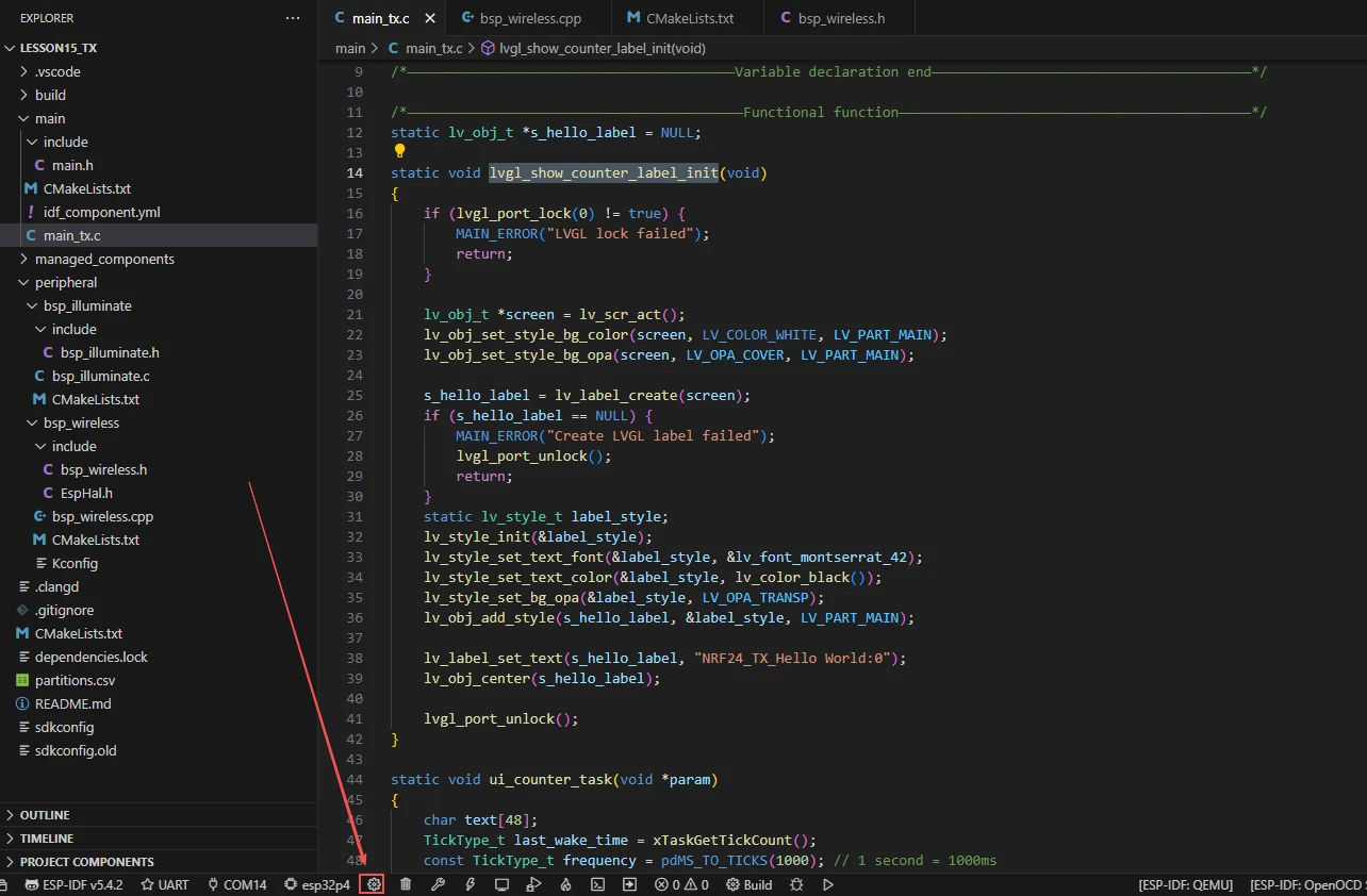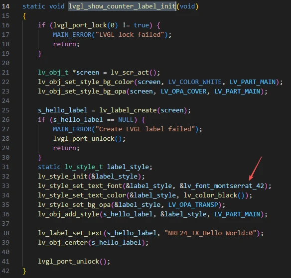 The function lvgl_show_counter_label_init() initializes the counter label on the LVGL display, used to show the nRF24L01 transmit count. Its workflow and purpose of each step can be summarized as follows: