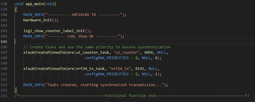 app_main() is the program entry function, responsible for completing hardware initialization, interface display setup, and launching wireless transmission and interface refresh tasks to implement the synchronized transmission and display functions of the nRF24L01.