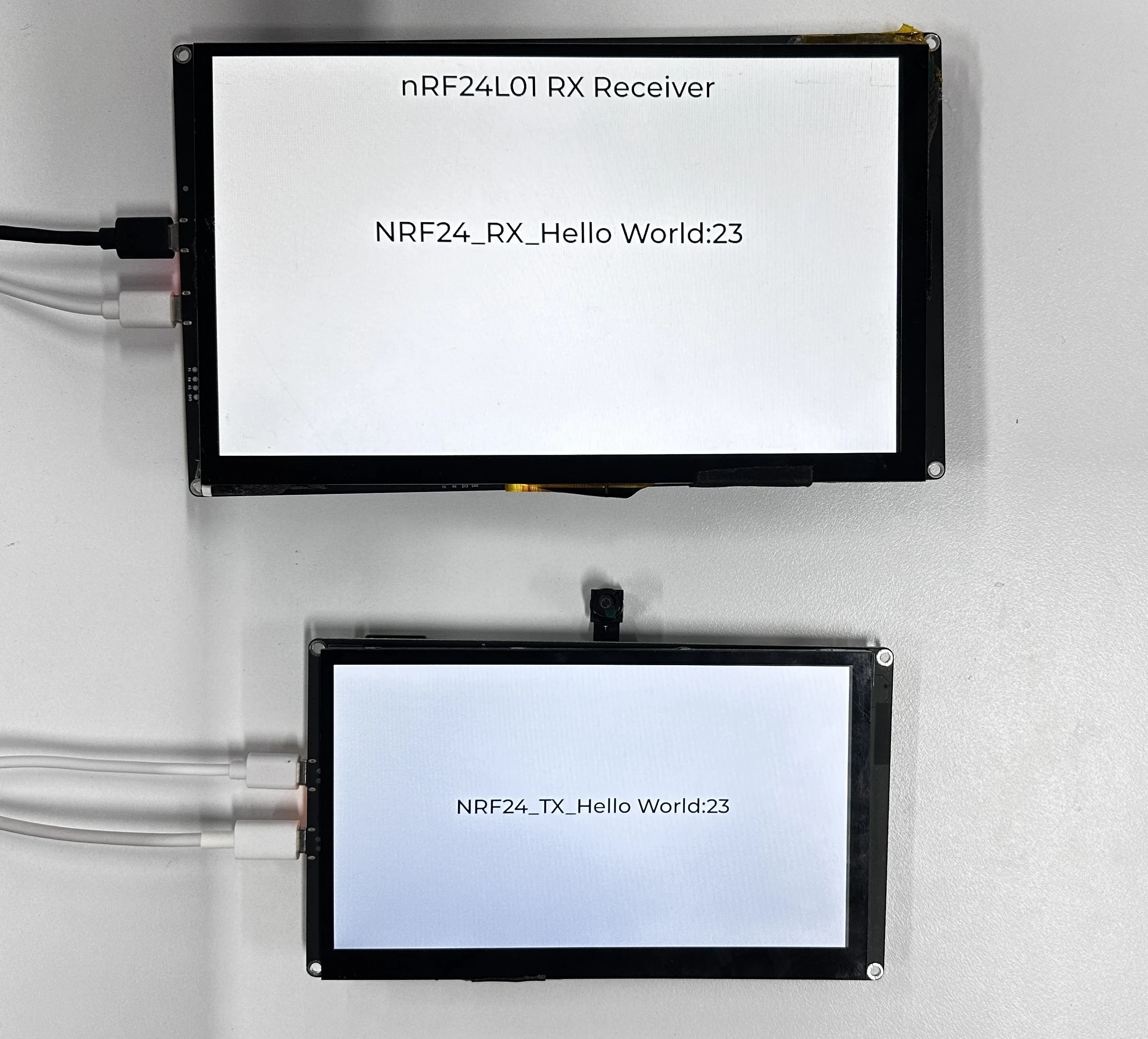 After running the code on both boards respectively, you will be able to see on the transmitter's Advance-P4 screen that the nRF2401 module is sending data labeled "NRF24_TX_Hello World:i", where "i" increases by 1 every second.