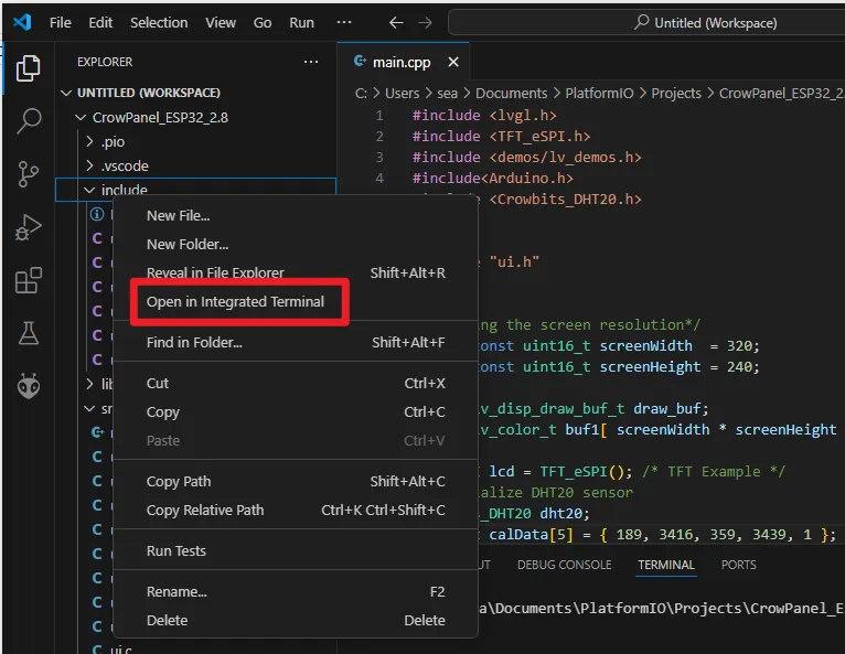 After adding, right click on lvgl and select "Open in Integrated Terminal"