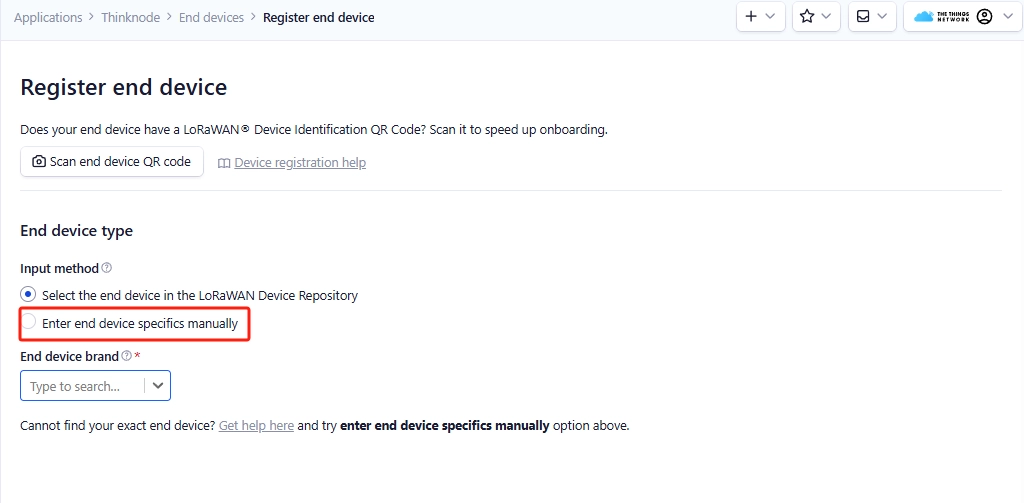 Step 4: In the “Register end device” page, click Enter end device specifics manually option.