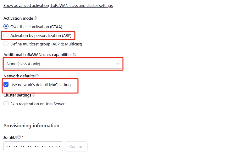 Step 6: Click Show advanced activation, LoRaWAN class and cluster settings. Configure parameters such as activation mode and device operating mode.