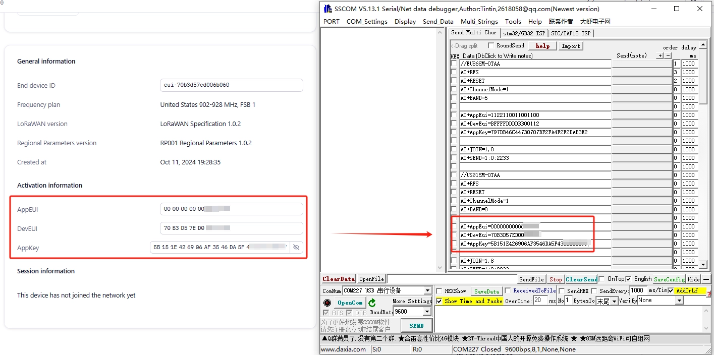 8、Set the node AppSKey: AT+AppSKey=C2D2B2F2E3A2F1A35D1256216553**** (the red part corresponds to the TTN server)